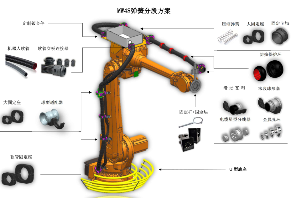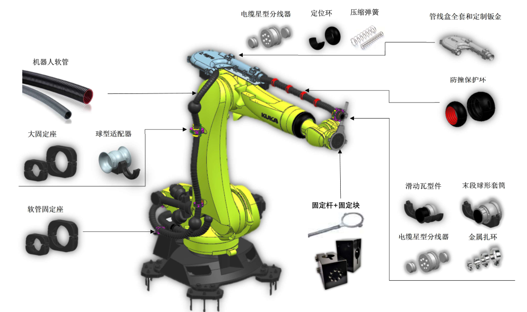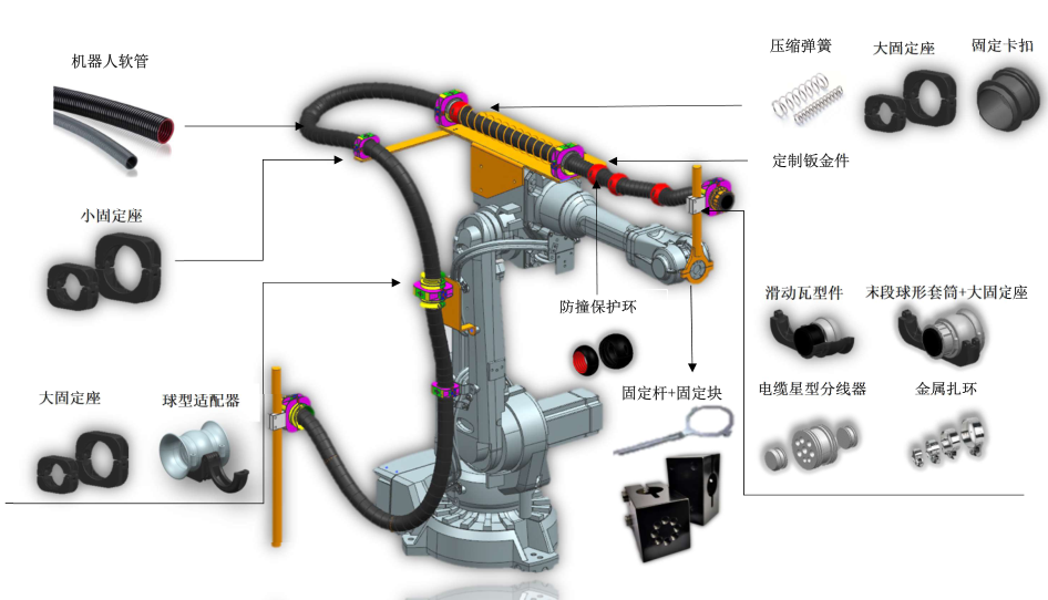 機(jī)器人管線包定位環(huán)軟管穿板連接器軟管連接器滑動(dòng)瓦型件末端球型套筒軟管固定座防撞保護(hù)環(huán)固定管夾系統(tǒng)球型適配器固定座內(nèi)夾機(jī)器人軟管協(xié)作機(jī)器人管線包應(yīng)用案例